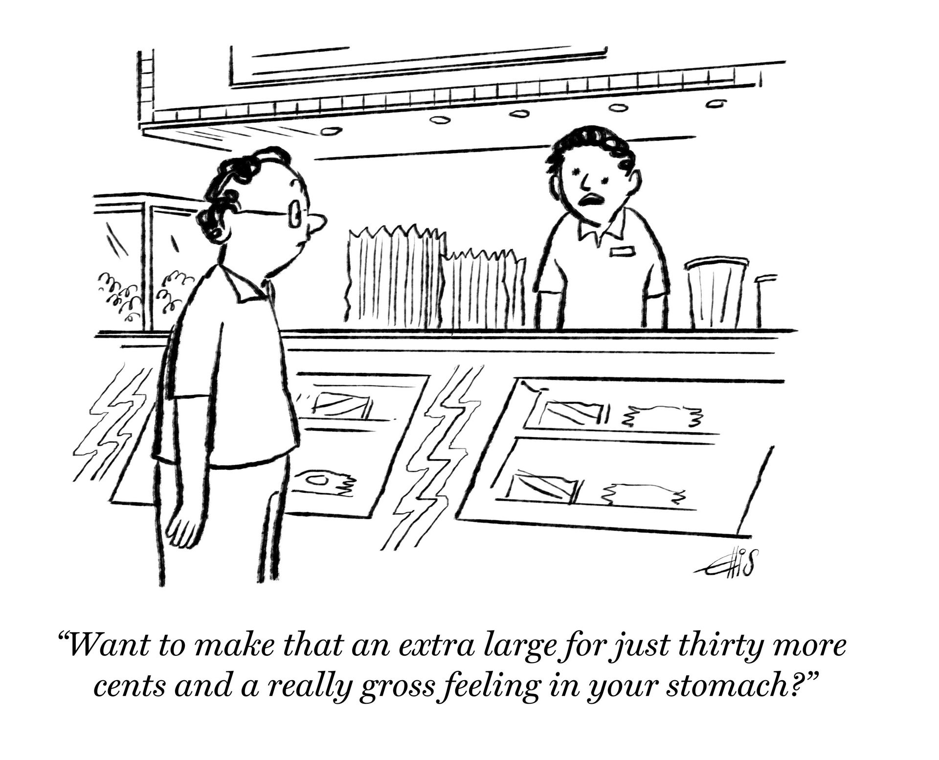 This is a cartoon about me never learning my lesson, which is always good cartoon fodder. I make it an extra large popcorn every time and every time I regret it. Not sure what else to say. Next!