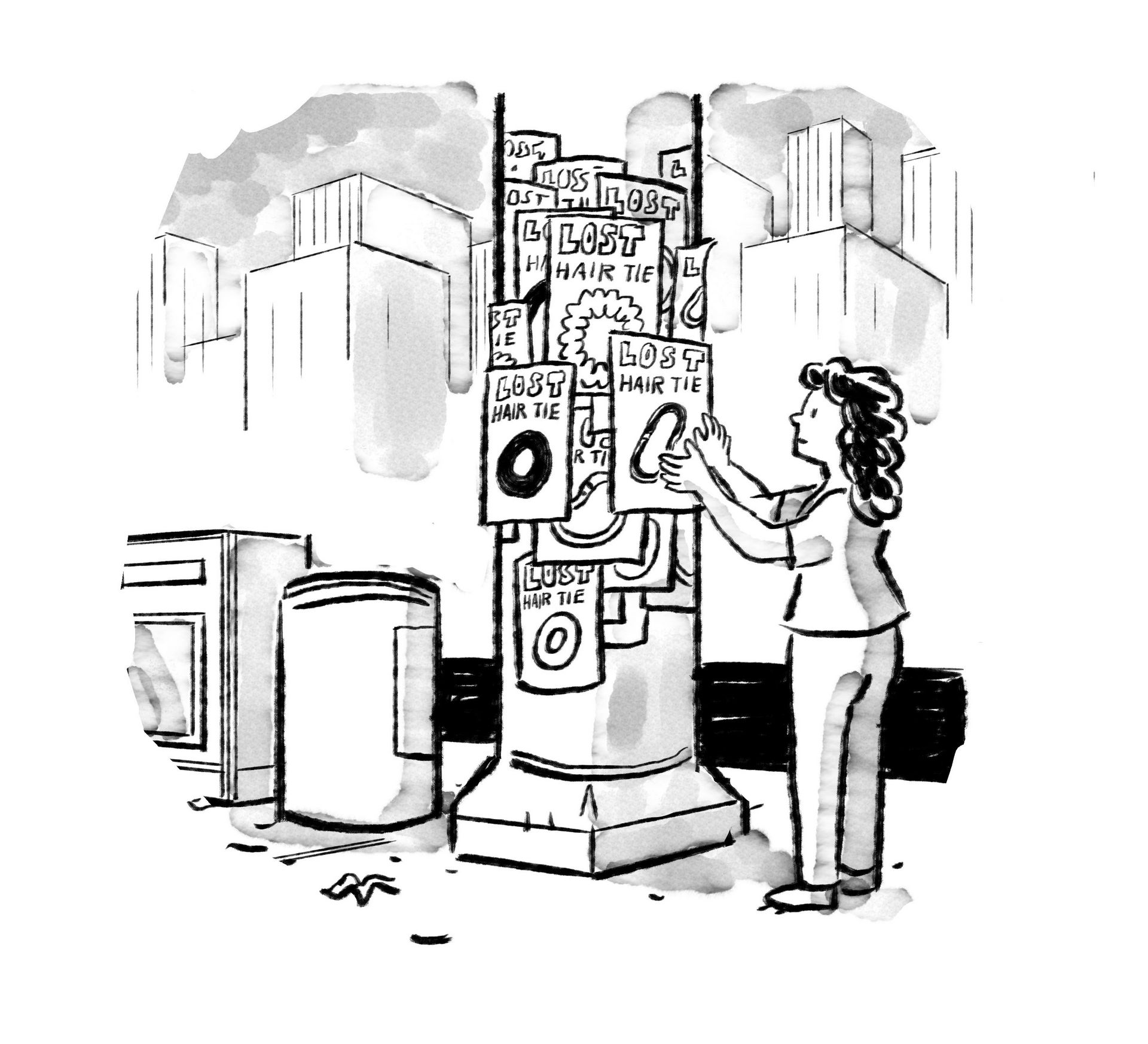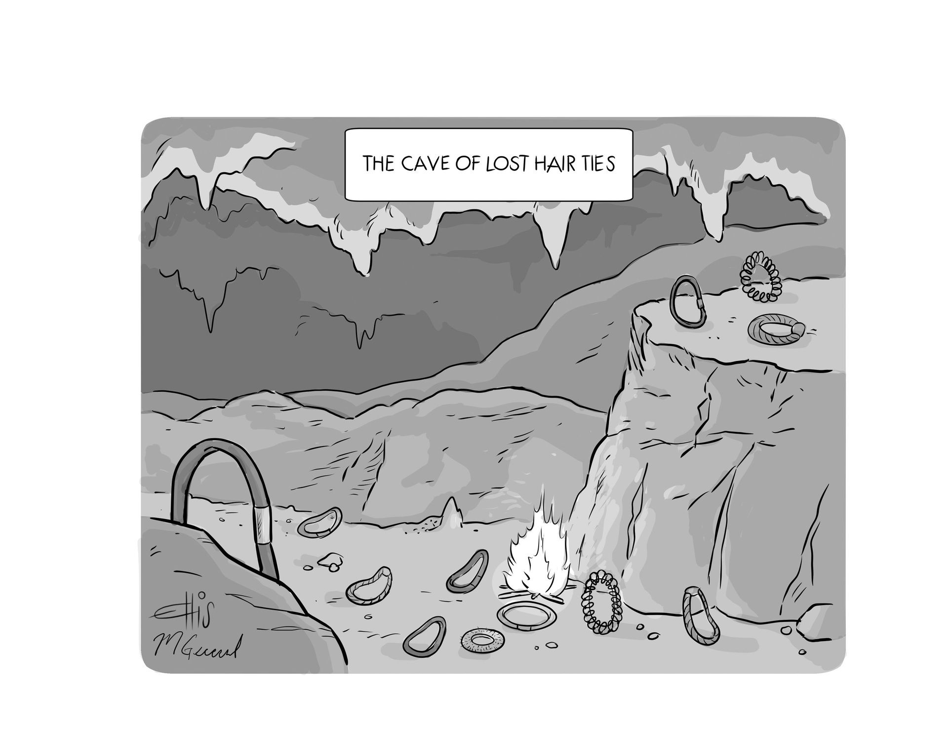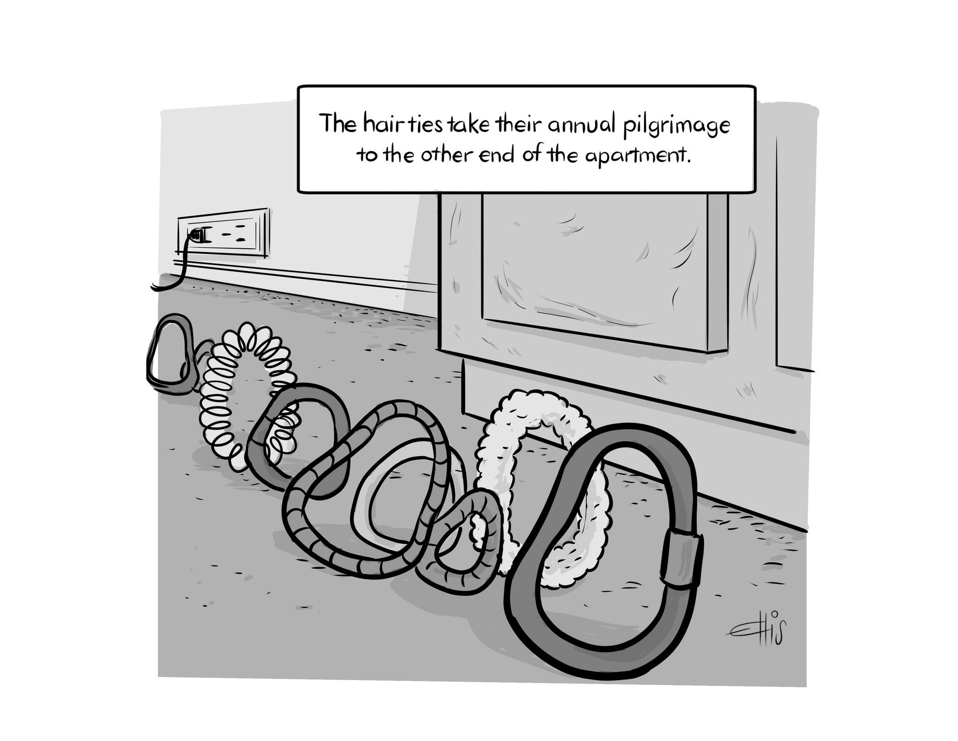 This cartoon is the latest in an ongoing attempt to sell a cartoon based off an inside joke I have with my wife. The general idea is about how her hair ties and scrunchies will disappear, reappear, move around and hide as if they were living creatures. This is my third try and it won’t be my last, damnit. I think the idea is funny. I love anthropomorphizing things. I love the word “anthropomorphize.” Who doesn’t? It’s fun. Anyway, here are the other two attempts from 2020: