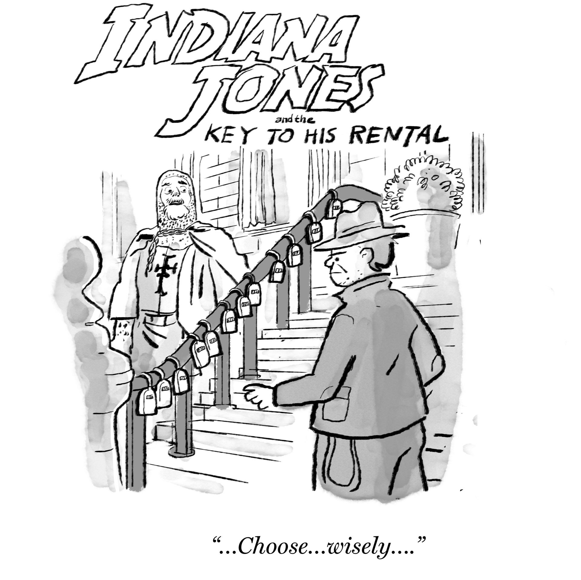 This cartoon is clearly a reference to Jones without it being a direct reference to one of the movies. It’s hard to decide which is the better angle. Cartoons deal in tropes, so one might be tempted to signify the reference without outwardly saying it. However, there’s really no reason to skirt around it either. If you’re talking Jones you might as well go fully in. Not that it mattered in these examples, as neither is particularly funny.